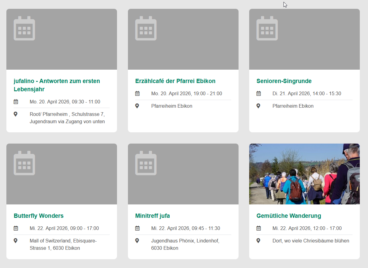 Schön finde ich das nicht. Ich hatte schon vor längerer Zeit ein entsprechendes Feedback an die Gemeinde geschickt: am einfachsten wäre es, die jeweiligen Veranstalter um ein Foto zu bitten…oder selbst ein Symbolbild zu verwenden…oder die Fläche des Platzhalters wenigstens farbig zu gestalten. Leider passiert nichts, es bleibt oft sehr grau…