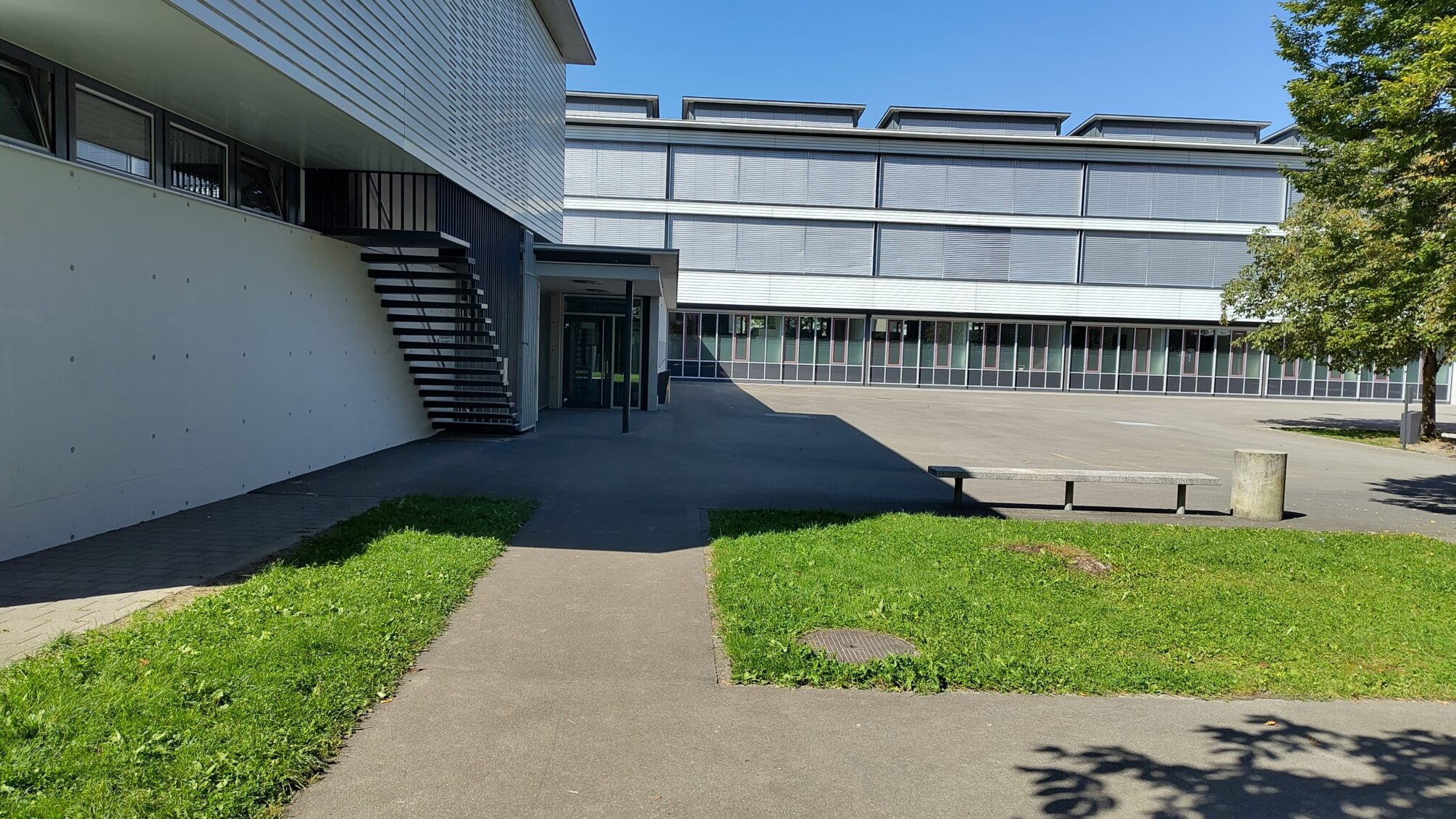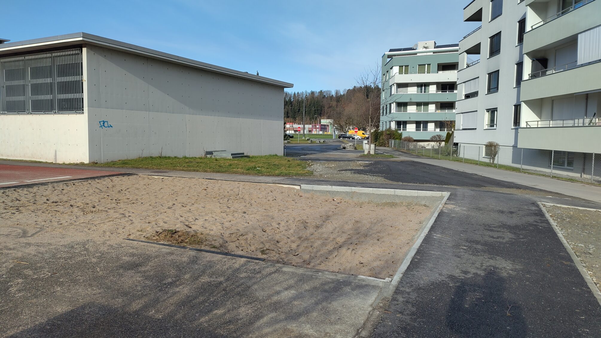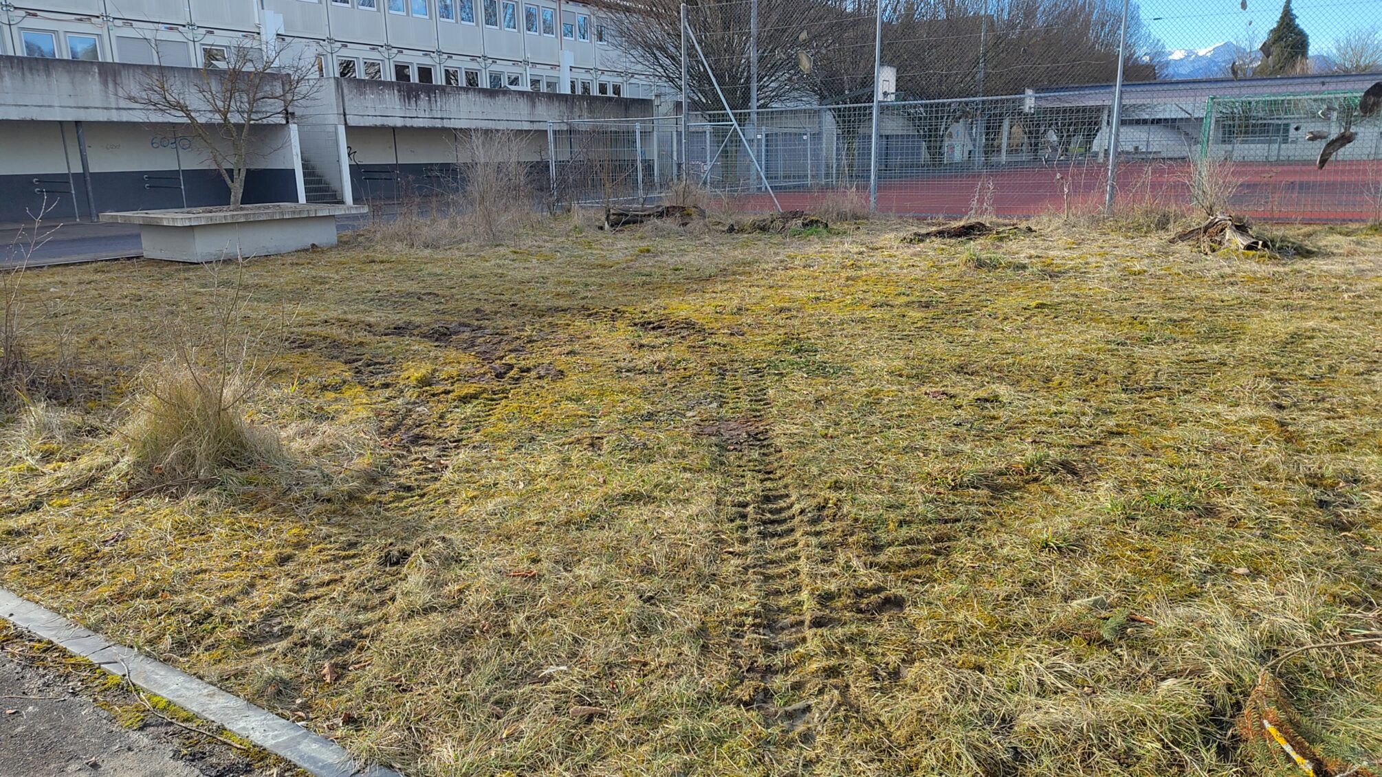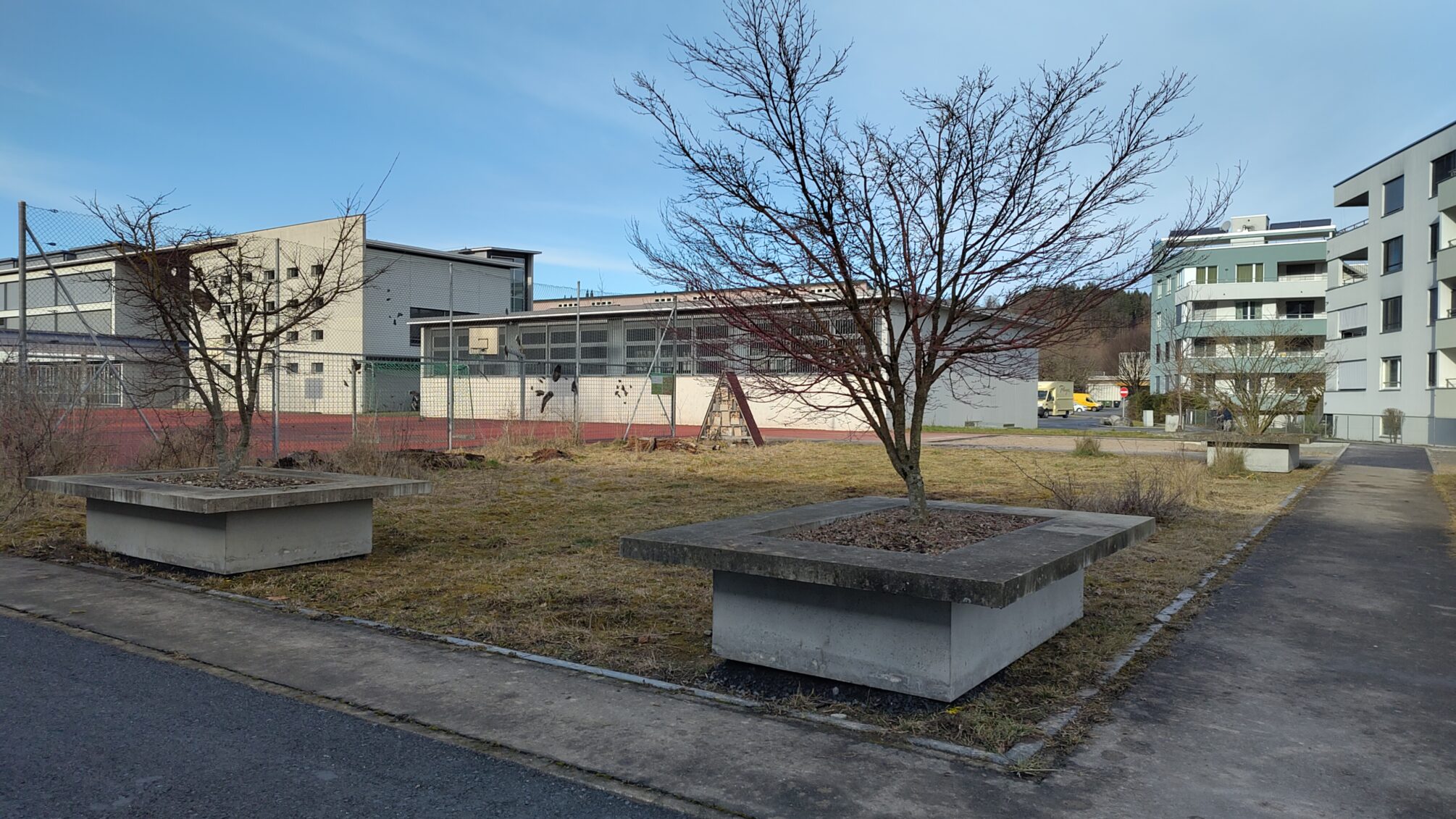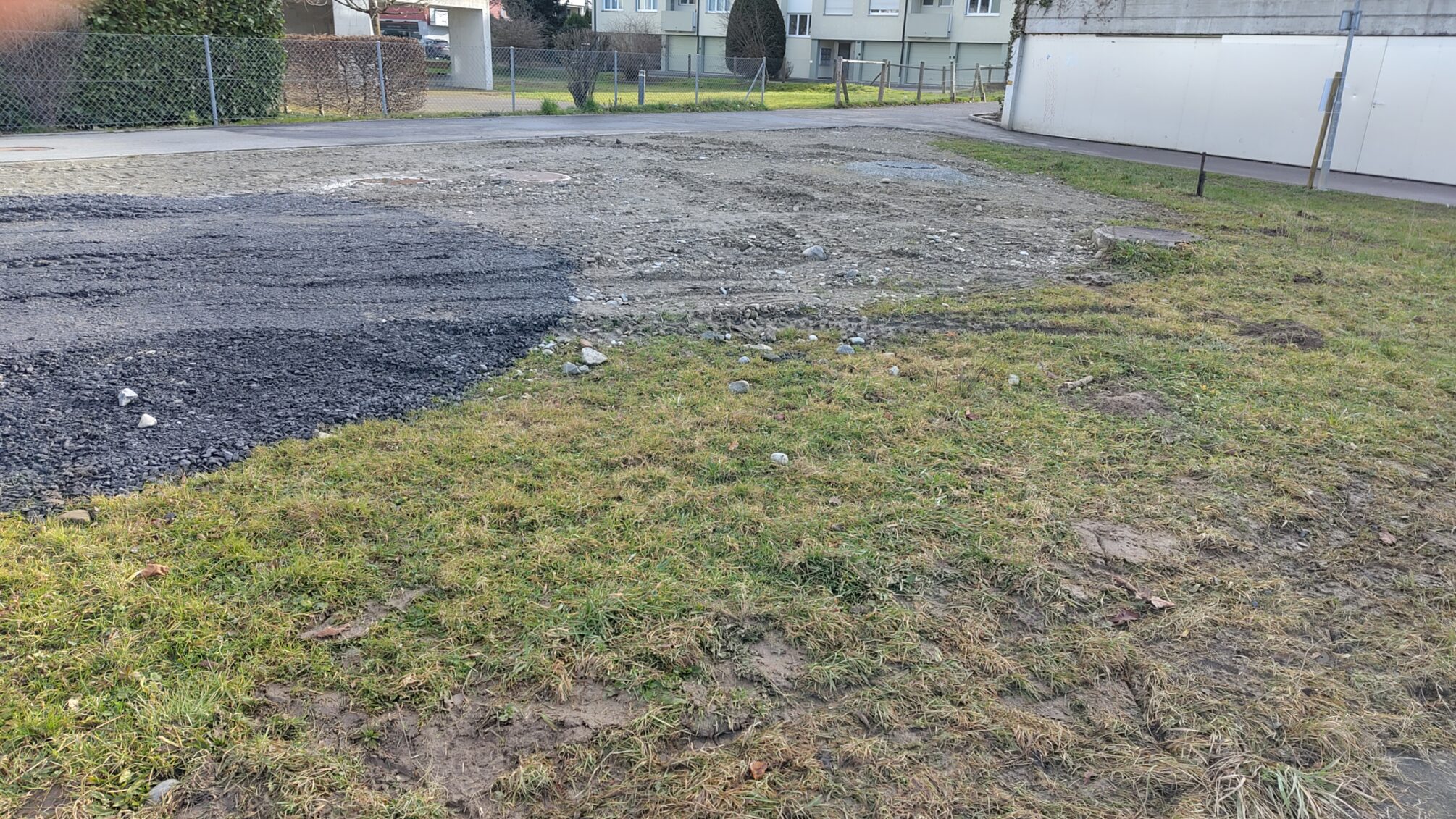 Eine im Zuge der Bauarbeiten abgetragene Wiese wird nicht ersetzt, über die entsprechende Kiesfläche sollen die provisorischen Schulcontainer dereinst (2028?) abtransportiert werden.