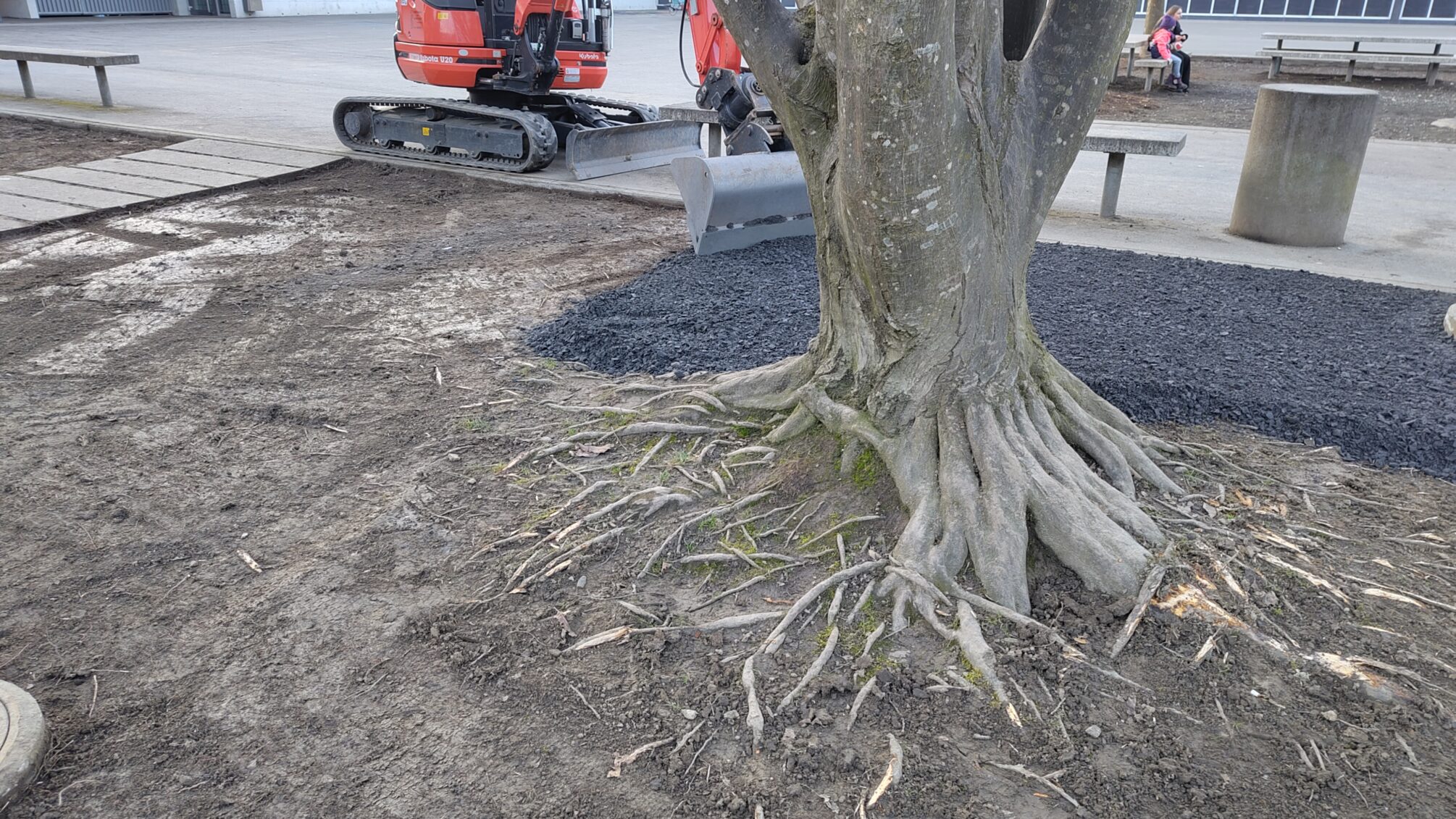 da wurde rings um die vorhandenen Bäume mit Schaufel und Bagger die oberste Schicht abgekratzt mitsamt Anteilen der obersten Wurzelschicht
