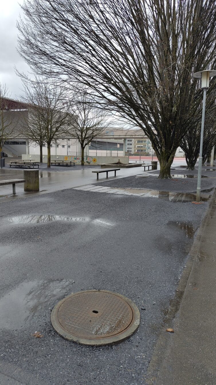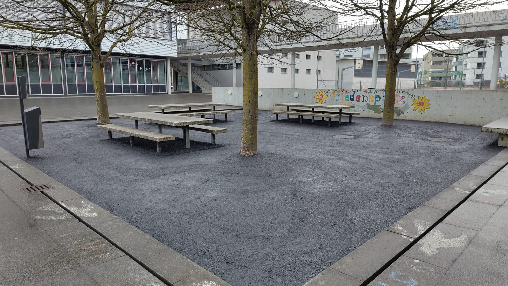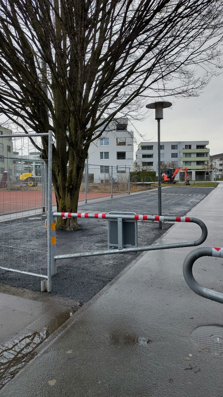 Heute (16.02.2026) wurde ein Teil meiner Fragen nach dem Warum und Wie der Aktivitäten rund ums Feldmattschulhaus beantwortet: „Auf dem Friedensplatz musste das Material um die Bäume ersetzt werden. Die Erde war stark verdichtet und führte zu starken Verschmutzungen der umliegenden Beläge.“ Wer sich das Foto des Friedensplatzes ganz oben anschaut, kann das wohl schwer nachvollziehen, oder? Auf jeden Fall blieben alle weiteren Fragen zum verwendeten Material, zur Entfernung von bestehenden Rasen- und Naturflächen und der Beeinträchtigung der Bäume durch Verletzung von Wurzeln und starker Verdichtung (!) durch die eingesetzten Arbeitsfahrzeuge unbeantwortet. Das empfinde ich als sehr frustrierend. So ist die aktuelle Situation heute (zum Vergrössern Foto anklicken)