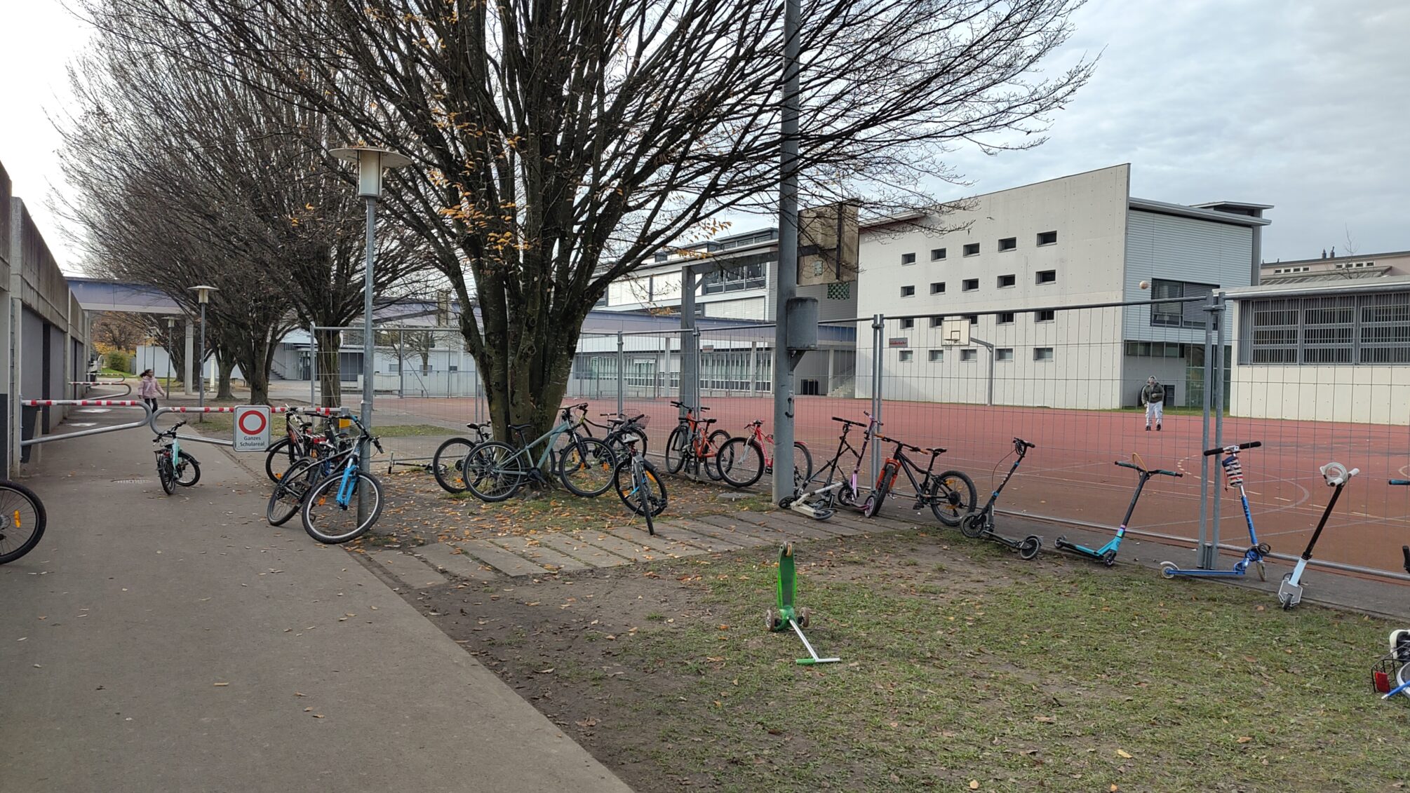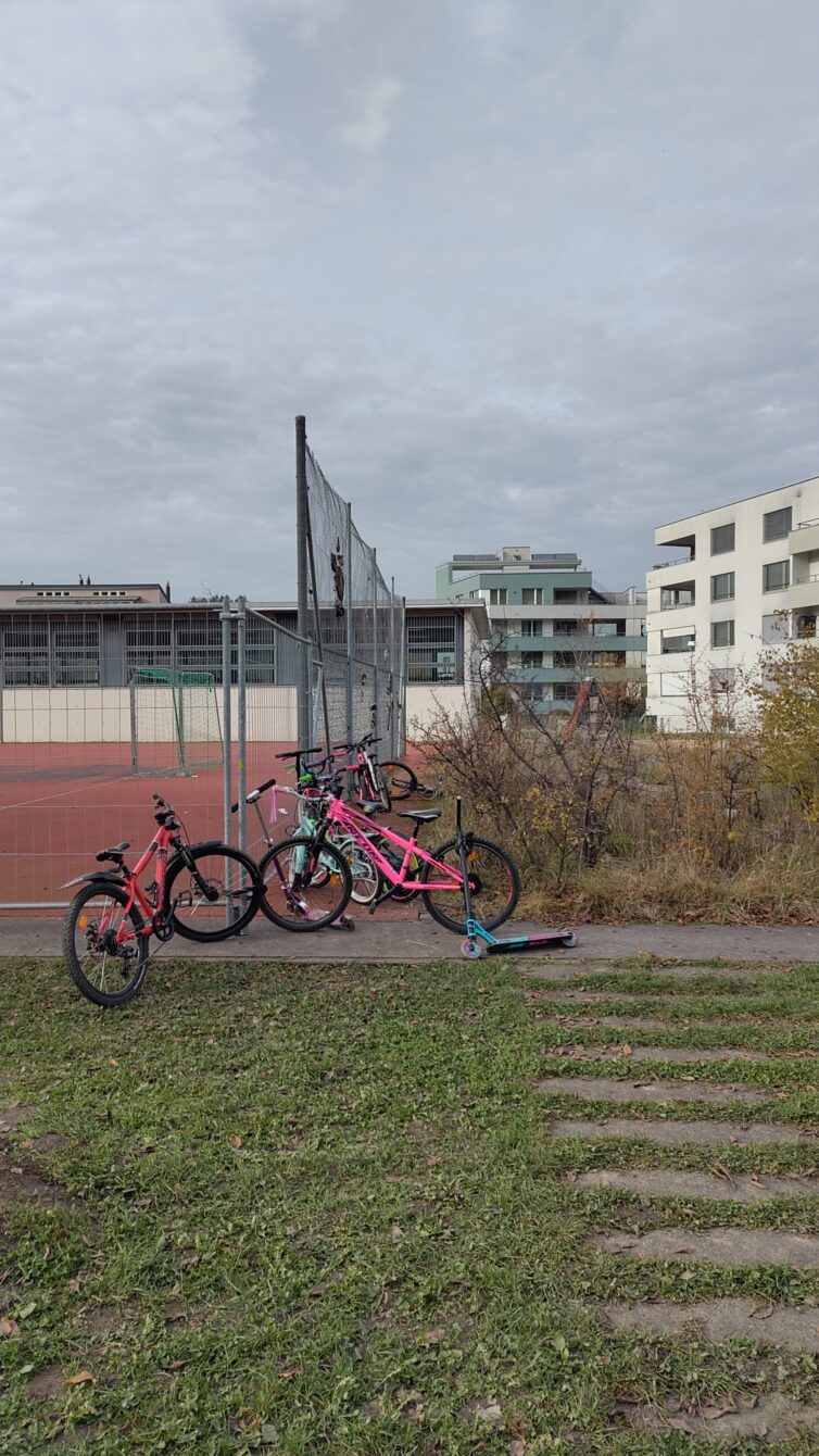 Wegen zu wenig Velo-Abstellplätzen stehen/liegen regelmässig Velos und Trotinettes im Gelände verstreut, auch auf dem Weg