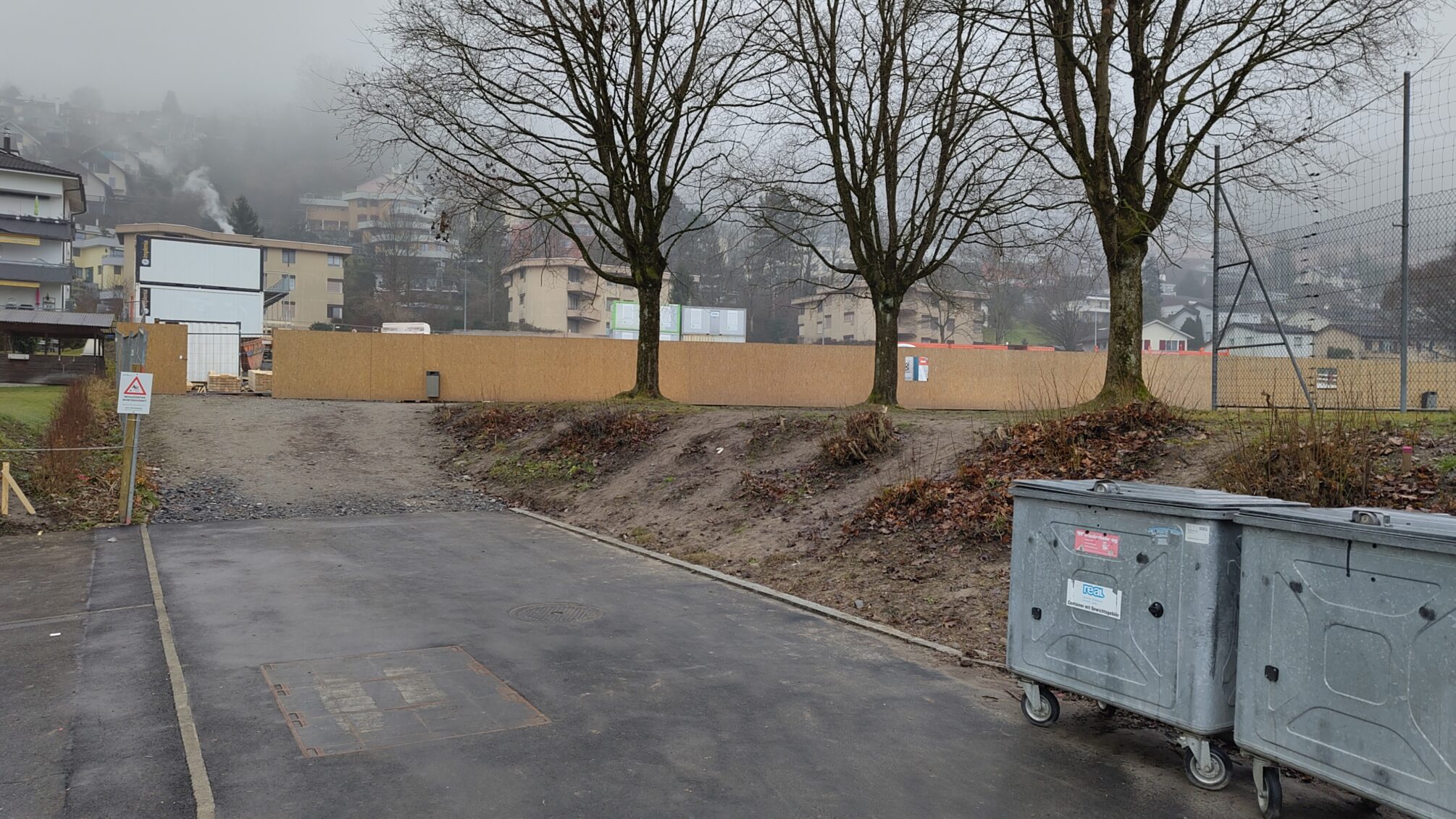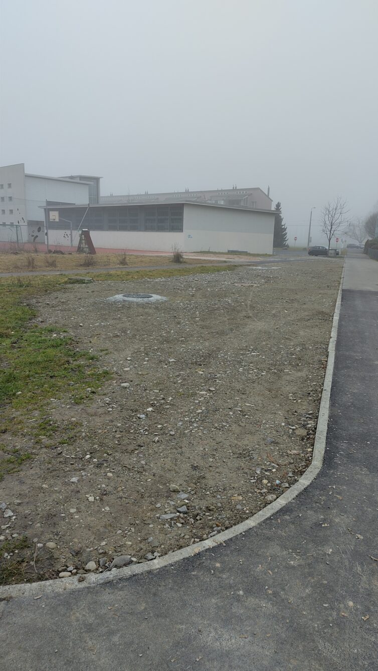 Eine im Zuge der Bauarbeiten abgetragene Wiese wird nicht ersetzt, über die entsprechende Kiesfläche sollen die provisorischen Schulcontainer dereinst (2028?) abtransportiert werden.